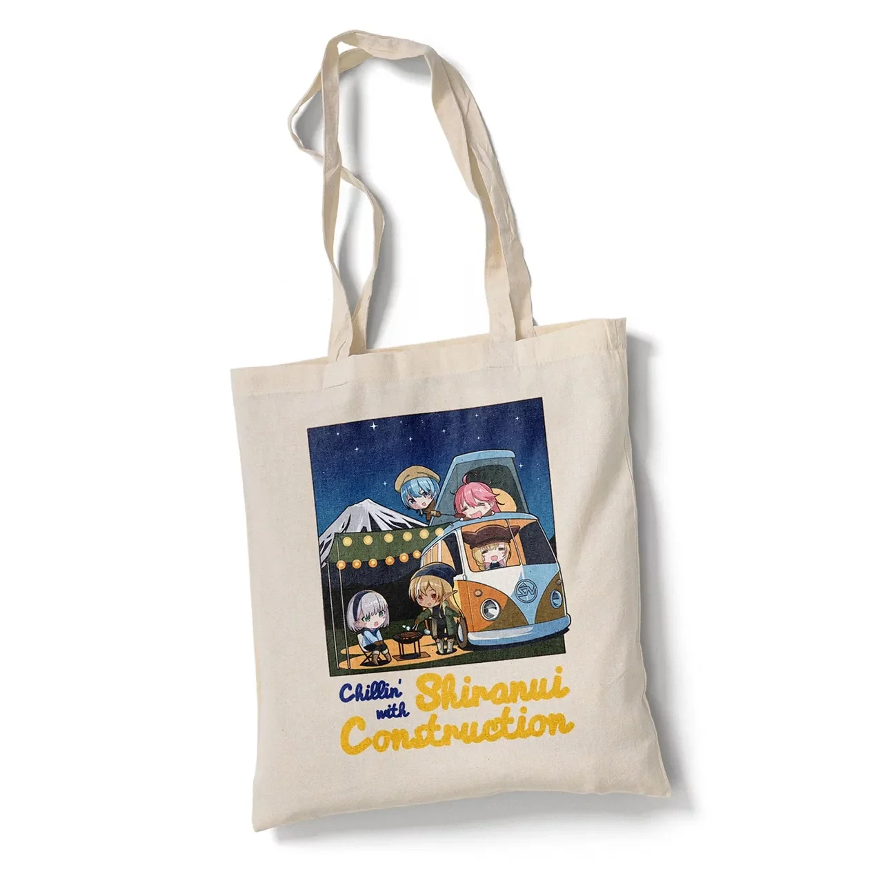 This bag features art of Shiranui Construction, the sub-unit consisting of Shiranui Flare, Hoshimachi Suisei, Sakura Miko, Omaru Polka, and Shirogane Noel, enjoying a nice camping trip.